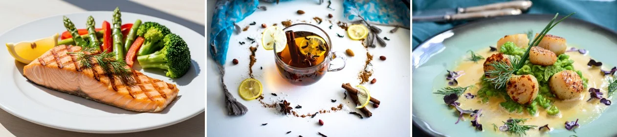 V hlavních restauracích se objeví tematická jídla inspirovaná regionem, například tacos s halibutem doplněné limetkovým zelným salátem, treska v křupavém těstíčku nebo syté krémové polévky z mořských plodů (seafood chowder), které jsou pro tuto oblast typické a především také čerstvý aljašský losos podávaný v různých úpravách.