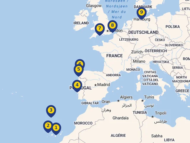 Poznejte místa, kde Vaše loď během plavby zakotví! Každá zastávka je označena číslem, které odpovídá její pozici na mapě, abyste mohli snadno sledovat celou trasu. Stačí kliknout na vybranou destinaci a zjistíte více o každé z nich. Pro lepší přehled si můžete celý program plavby prohlédnout přímo na mapě.