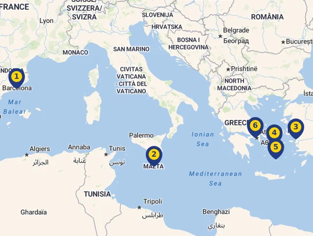 Poznejte místa, kde Vaše loď během plavby zakotví! Každá zastávka je označena číslem, které odpovídá její pozici na mapě, abyste mohli snadno sledovat celou trasu. Stačí kliknout na vybranou destinaci a zjistíte více o každé z nich. Pro lepší přehled si můžete celý program plavby prohlédnout přímo na mapě.
