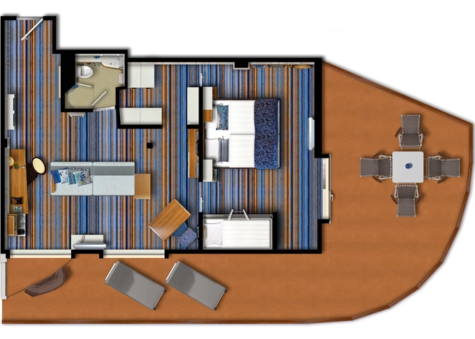 | SUTO - Themen Suite 54 m² + balkon 15 m² se stolem, lehátkom a houpací sítí. Ložnice, Obývací část, šatník. 10. paluba. Max 4 osoby. Výhody Suite. | 147 024 Kč 36 756 Kč za osobu | ||