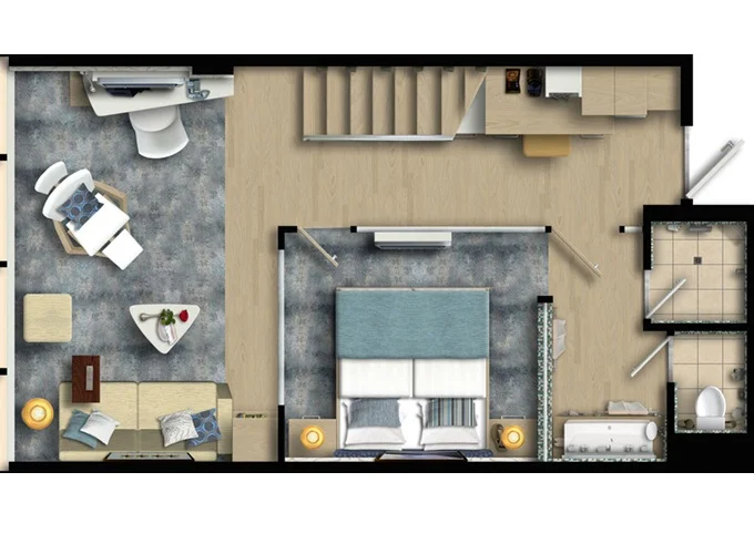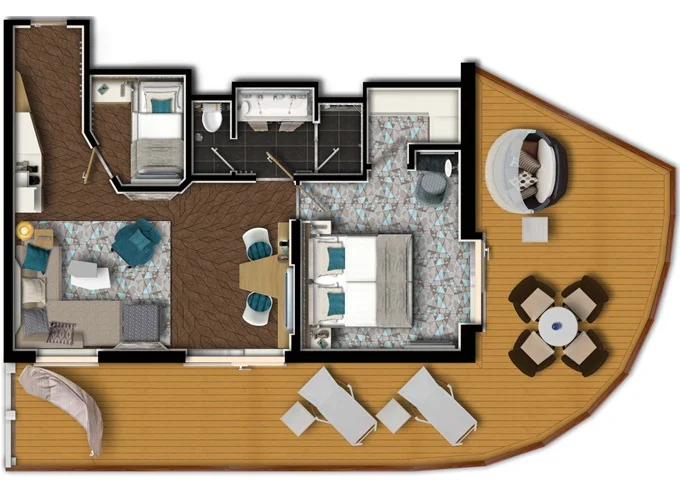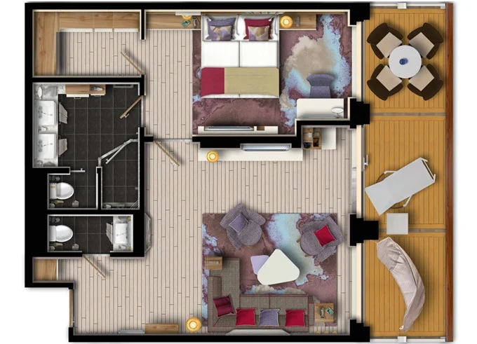 | SKTO - Themen Suite 54 m² + balkon 15 m² se stolem, lehátkom a houpací sítí. Ložnice, Obývací část, šatník. 10. paluba. Max 4 osoby. Výhody Suite. | 508 626 Kč 169 542 Kč za osobu | ||