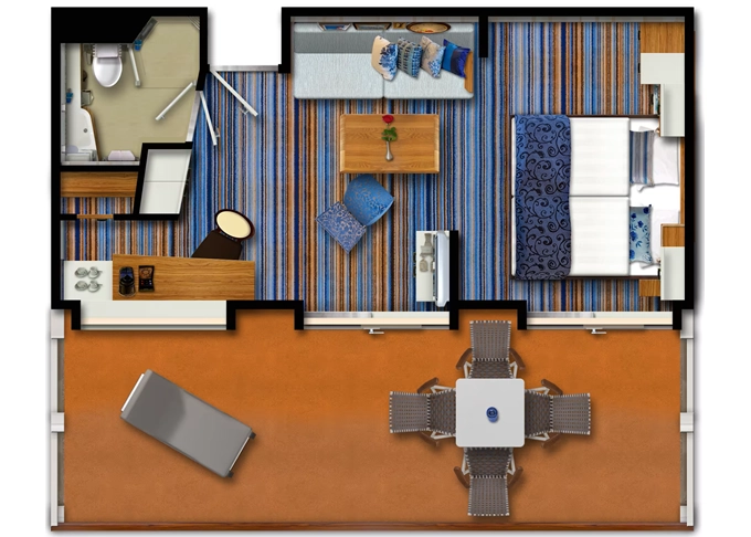| SUTO - Themen Suite 54 m² + balkon 15 m² se stolem, lehátkom a houpací sítí. Ložnice, Obývací část, šatník. 10. paluba. Max 4 osoby. Výhody Suite. | 432 346 Kč 216 173 Kč za osobu | ||