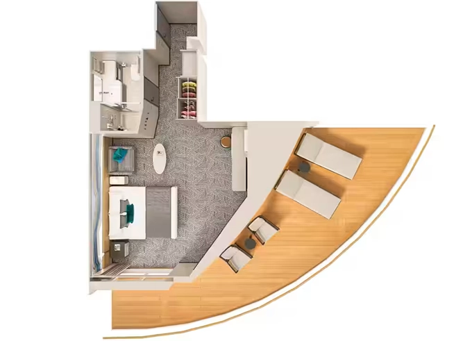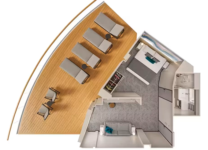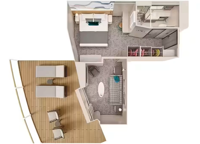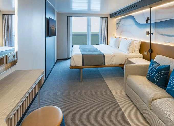 SI - Suite s velkým balkónem na zádi 24 m² / balkon 19 m². 9. paluba - vzadu. Max 2 osoby. Výhody Suite. 203 914 Kč 101 957 Kč za osobu
